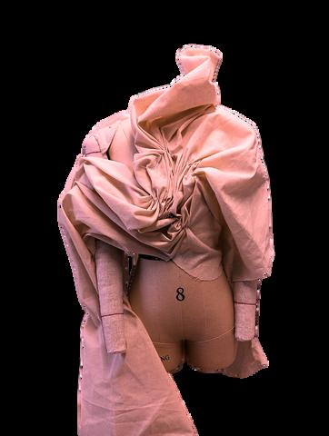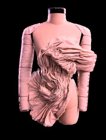PARA EL SEGUNDO LOOK, SE OPTÓ POR UNA MAYOR EXPERIMENTACIÓN CON EL TEJIDO EN ESTE CASO PARA LA PARTE SUPERIOR SE MODELÓ DIRECTAMENTE EL TEJIDO SOBRE EL MANIQUÍ CON LA TÉCNICA DE MOULAGE