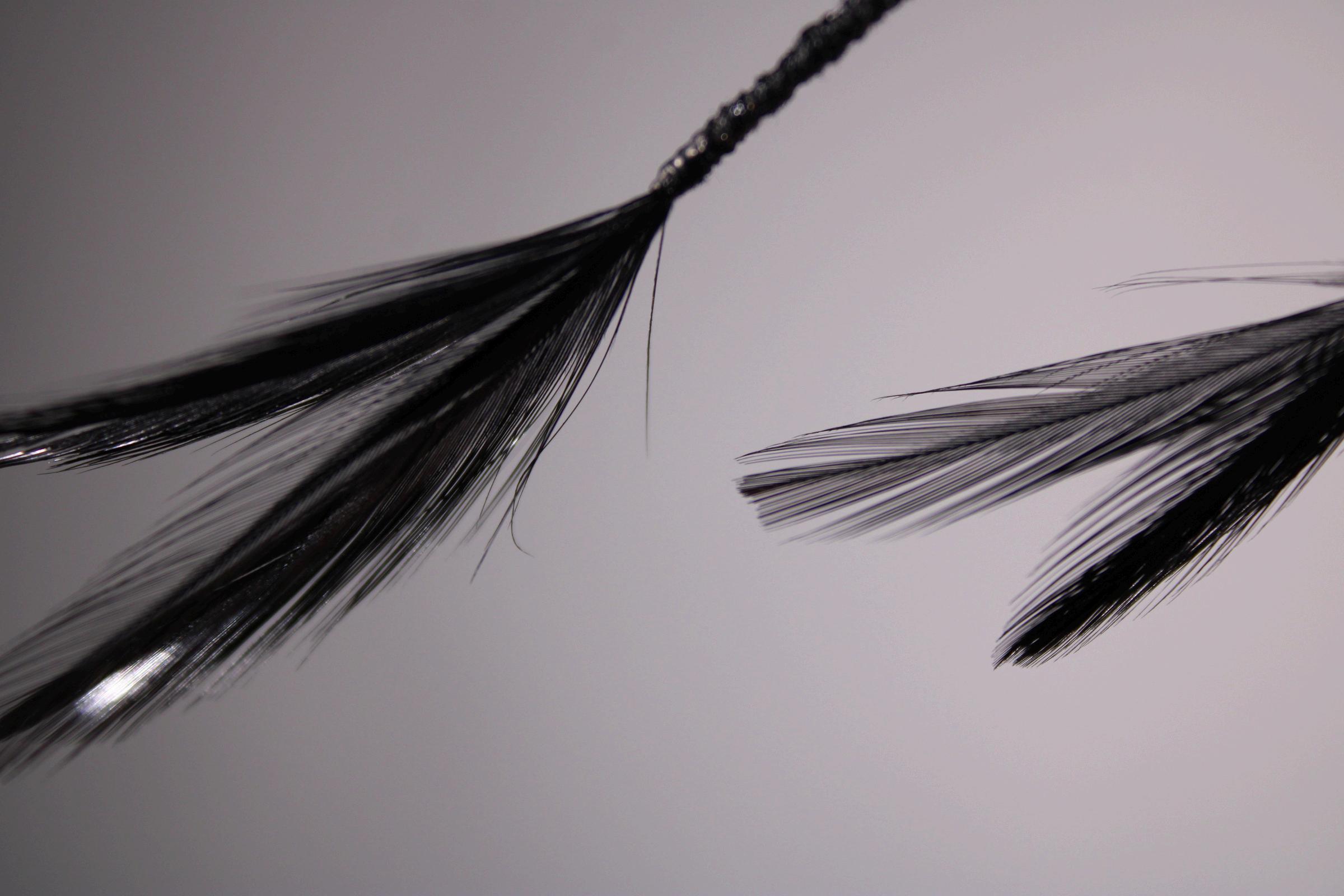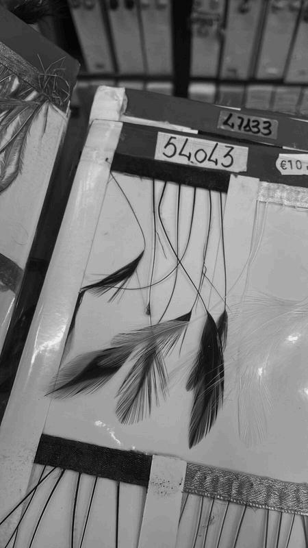 Mientras se secaba, se dio forma a la estructura que sustentaría el tejido, a partir de alambre de sombrerería blanco; se pintó de negro, se dobló y cortó (2) Se hicieron tres nervios internos y dos transversales para abrir y mantener la forma Cada nervio de alambre se cosió entre sí El encaje, ya aprestado y seco, se colocó en la base con alfileres y se cosió a mano (3). Para el enganche, se cosió una peineta a la base. Finalmente, en las puntas de cada nervio se colocaron 5 plumas (4).