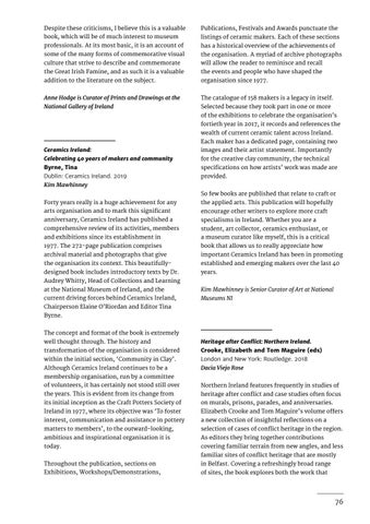 Selected because they took part in one or more of the exhibitions to celebrate the organisation’s fortieth year in 2017, it records and references the wealth of current ceramic talent across Ireland. Each maker has a dedicated page, containing two