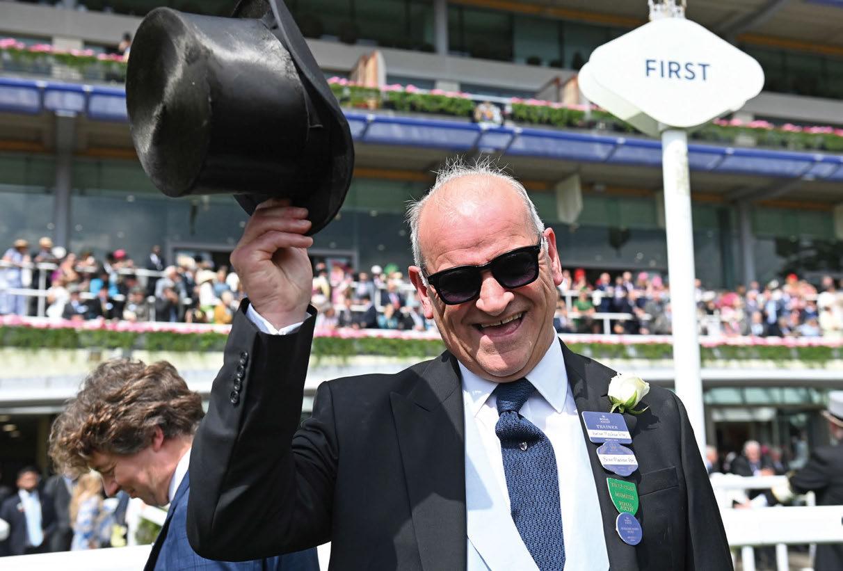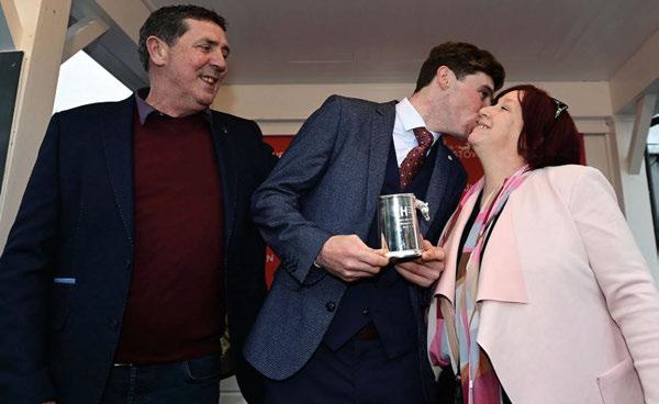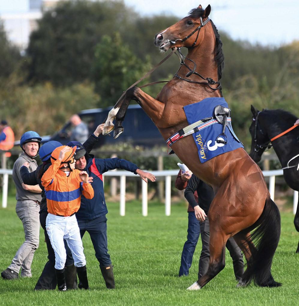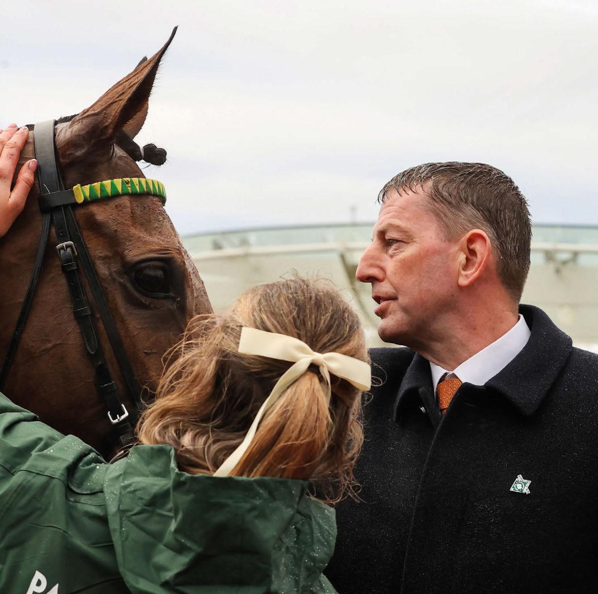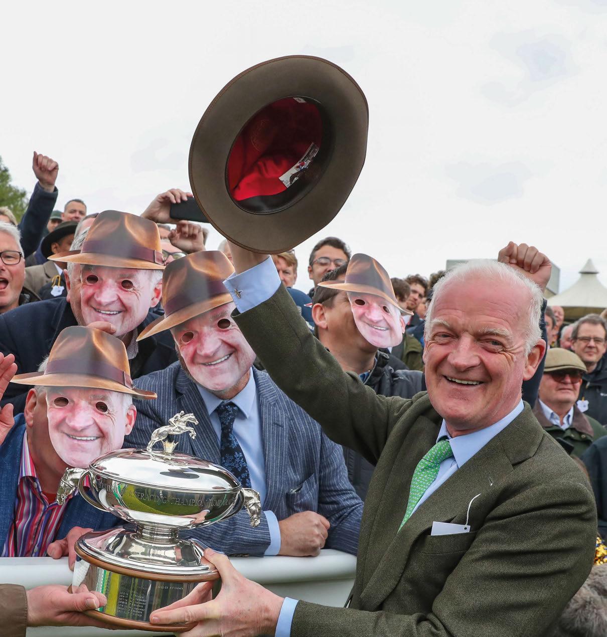 Front cover: Willie Mullins kicks off the celebrations with racing fans from Skerries in Willie Mullins masks, after the Closutton trainer is crowned British champion at Sandown in April
