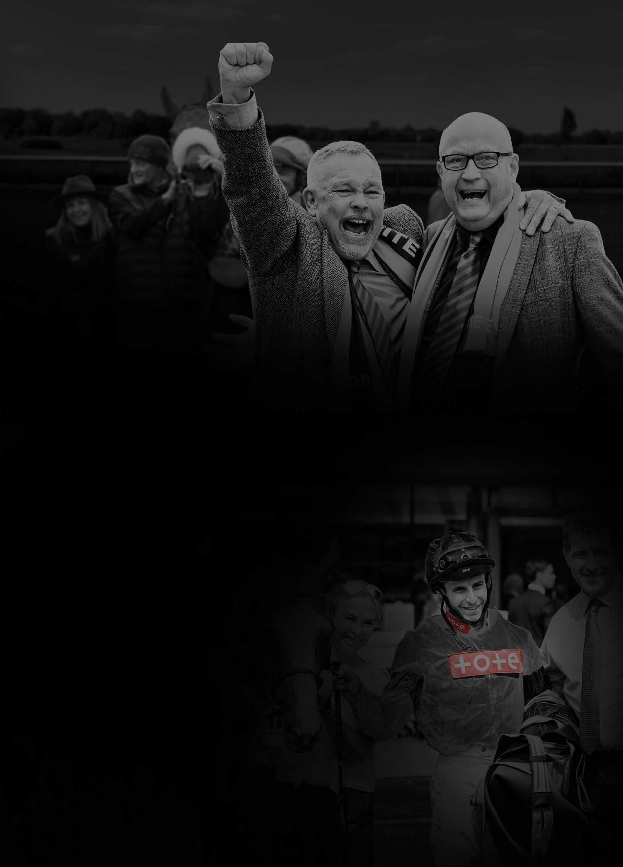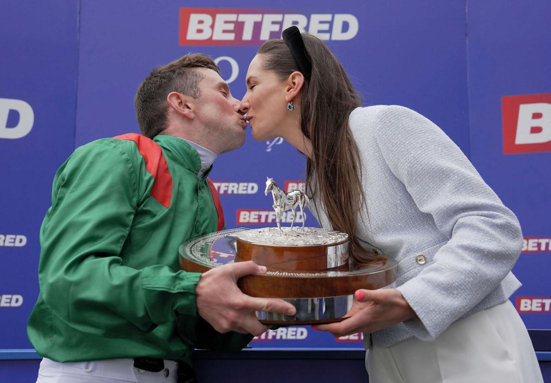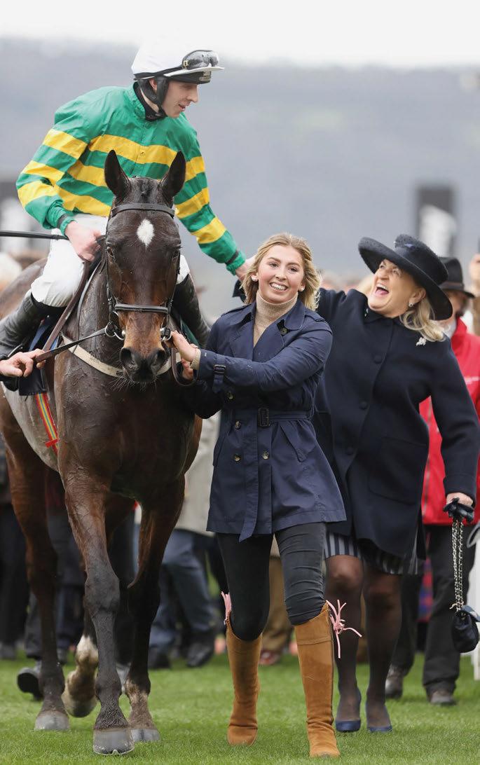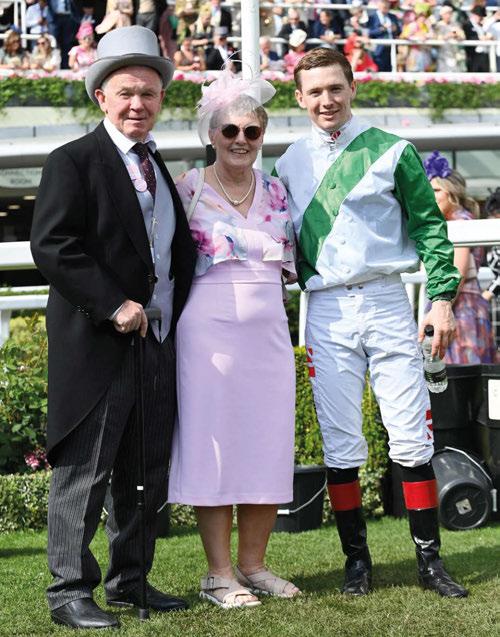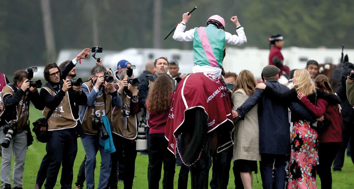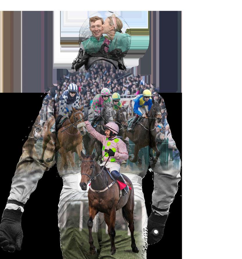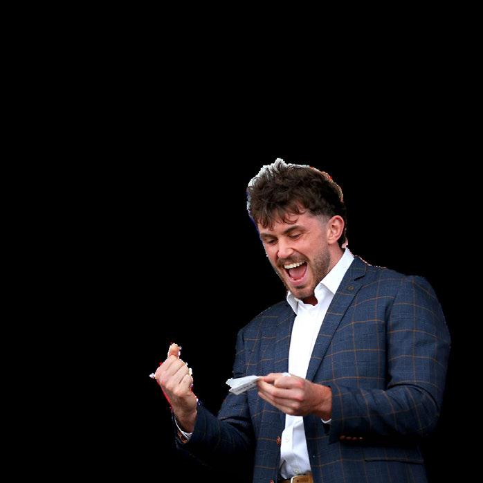 Front cover: Willie Mullins kicks off the celebrations with racing fans from Skerries in Willie Mullins masks, after the Closutton trainer is crowned British champion at Sandown in April