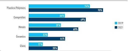 Fig 2. Shows how there was improvement in the 3-D printingmaterialsamongtheyears2019-2021.Andthe substances that are used to its maximum potential are plastics/polymer, composites and metal. This graph additionally suggests the popularity of additive manufacturing(3-Dprinting)insidethemarketplace.