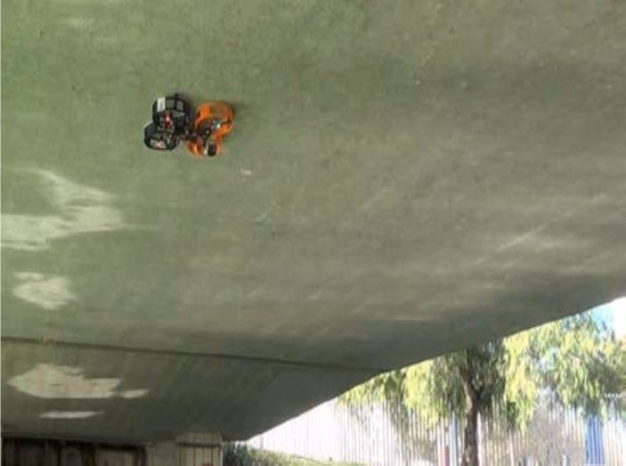 •Thedronecanhoveragainstthebridge’sunderside,with thepropulsionsystemstillon.Theceilingeffectreducesthe neededthrustandensuresstablecontact,asshowninFig.9.