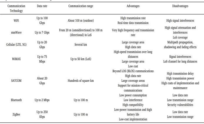 Table 2 provides an overview of the most relevant communication technologies for IoD, outlining their data transmissionrequirements,communicationranges,andkey advantagesanddisadvantages.
