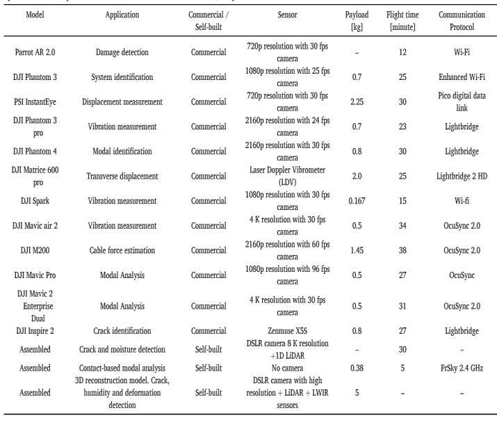 In this section, we discuss how drones are used for monitoring bridges. Table 1 shows applications from academic literature and does not aim to represent drones availableforpurchase.Thus,recentlydevelopeddroneslike theDJIMINI4PROorPOTENSICATOMSEarenotincluded, astheyhavenotyetbeenmentionedinpublishedstudies. However, the authors believe that lightweight drones like these will be important for drone-based inspection. They offer a low-cost and easy-to-use solution for bridge monitoring.
