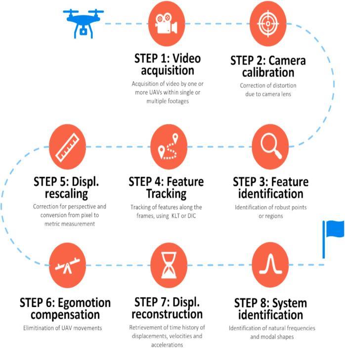 STEP 8: System identification. OMAtechniquesareapplied to extract frequencies and modal shapes. Some studies identifynaturalfrequenciesusingpeak-pickingbutdonot extract modal shapes. Other studies use time-domain identification methods to derive modal shapes from the observed displacement data. For example, Hoskere et al. analyze displacement series from multiple points along a bridge, collected through various acquisitions, to extract localmodalshapesusingtheNaturalExcitationTechnique fortheEigen-SystemRealizationAlgorithm(NeXTERA).The local modal shapes obtained from different points are combined using the decentralized modal analysis method proposedbySimetal.ArelatedstudybyHaciefendiogluet al.exploresthereconstructionofmodalshapesincomputer vision,usingafixedcamerainsteadofadrone.Theirmethod employsspectralanalysistoolssuchastheAutoregressive