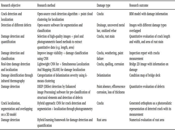 Inbothcrackdetectionanddamagerecognition,imagescan undergo pre-processing or post-processing to improve results.Duqueetal.differentiatedbetweenhigh-qualityand low-quality images by evaluating sharpness and entropy. Imagesarethenprocessedusingpixel-basedmeasurement software like ImageJ or through a photogrammetric approach.Theycompareresultsbasedonoutputqualityand computationtime.Jeongetal.suggestedaprocedurewhere, after using machine learning for damage detection, they enhancethequalityofimagesshowingdamagetosimplify