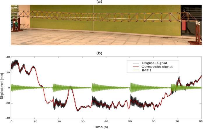 Second,theunfilteredtimehistoriesfromtheexperiments, showninFig.12(a)andFig.13(b),displaylow-frequency oscillations due to drone dynamics. These oscillations overlap with the higher-frequency vibrations of the structure,whichoccurinresponsetotheexternalexcitation. Additionally,theFFTplotinFig.12(b)showsdistinctpeaks thatcorrespondtothestructure’snaturalfrequencies.These peaksstandoutdespitethenoisefromdronedisturbances. In contrast, Fig. 13 (b) demonstrates how well egomotion compensation works in isolating the true structural vibrationtimehistory.Thecompensationprocessremoves drone-related disturbances, leaving the resulting signal (identified as IMF 1) clearly showing the structural vibrations.