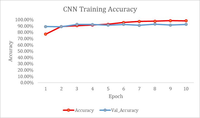 Figure4illustratesthemodel’saccuracyprogressionduring training. With a dataset comprising 1,931 fire images and 2,083non-fireimagesfortraining,and225fireimagesand 267 non-fire images for validation, the model improved steadily.Accuracybeganat77.17%fortrainingand89.02% for validation in the first epoch, climbing to 98.31% and 92.48%bythetenthepoch.Thisimprovementdemonstrates the model's ability to recognize fire effectively while maintainingstrongperformanceonunseenvalidationdata.