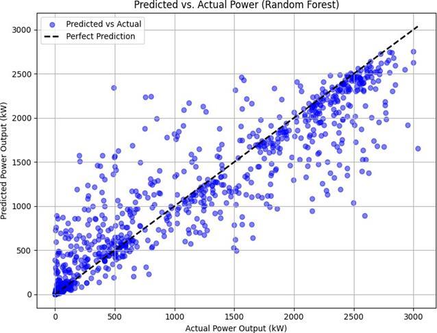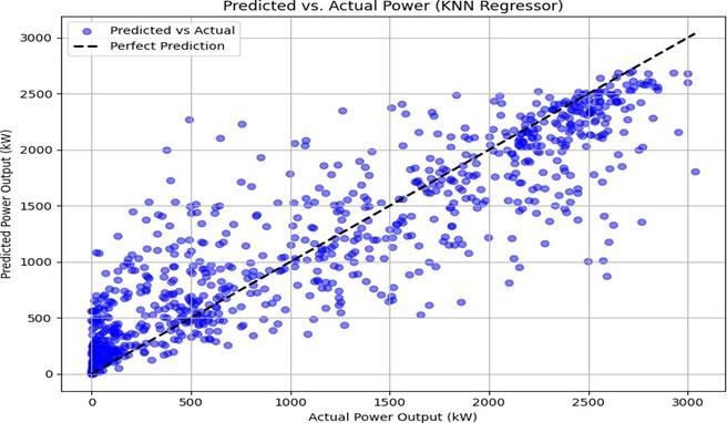 TheplotsshowthattheRandomForestmodel'spredictions (Figure2)aremoretightlyclusteredalongthelineofperfect predictioncomparedtotheKNNmodel(Figure1),especially at higher power output values. This suggests that the ensembleapproachofRandomForestisbetteratcapturing the underlying non-linear relationships and complex interactions between the meteorological features and the generatedpower,akeystrengthofthealgorithmnotedinthe literature[7,8].ThewiderdispersioninKNN'spredictions highlightsitssensitivitytothelocalstructureofthedataand thecurseofdimensionality,whichcanlimititsperformance oncomplexdatasets[12].