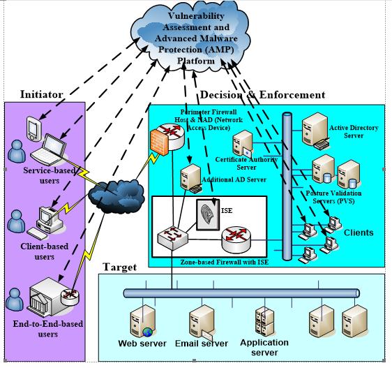 In order to address these deficiencies, this study aims to introduce a framework that integrates aspects such as policy-driven, hybrid access-control framework that combines Cisco Advanced Malware Protection (AMP) for threat analysis, Qualys for vulnerability assessment, Cisco Identity Services Engine (ISE) for dynamic policy