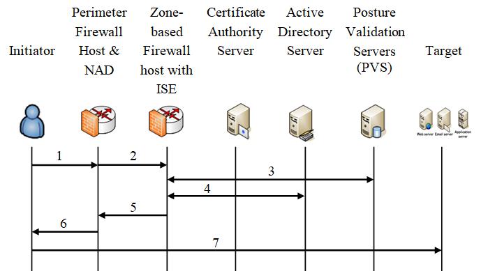 1) The Initiator submits an access request through the perimeterfirewallhostandNAD.