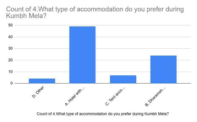 Thebarchartindicatesthat Hotel with modern facilities is the most preferred type of accommodation during the KumbhMela,receivingnearly50responses.