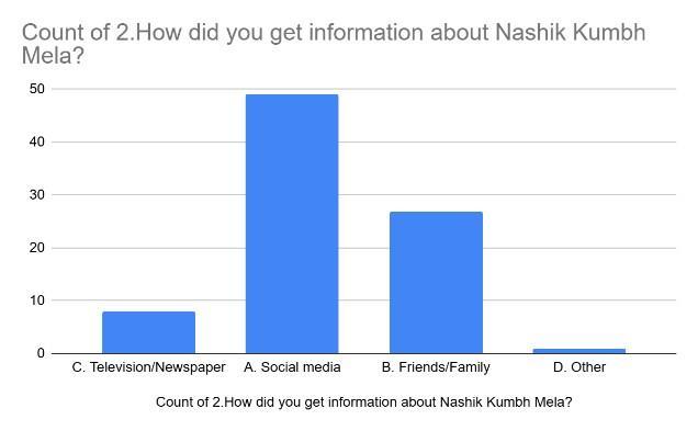 Based on the provided bar chart, Social media was the most common way people got information about the Nashik Kumbh Mela, with a count approaching 50. The next most significant source of information was Friends/Family, which accounts for roughly half the responsesseenforsocialmedia.Traditionalmedialike