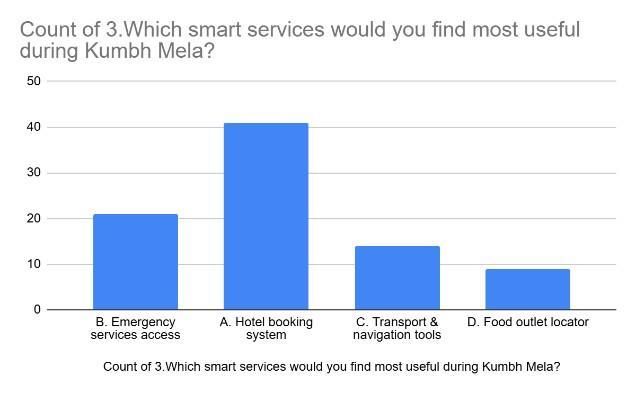 Based on the chart, the Hotel booking system was overwhelmingly considered the most useful smart service during the Kumbh Mela, with a count exceeding 40. Emergency services access wasthesecond most desired service.Incontrast, Transport & navigation tools andthe Food outlet locator were found to be less useful by the respondents.