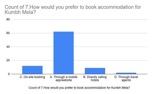 Based on theabove bar chart, the most preferred method tobookaccommodationfortheKumbhMelais Through a mobile app/website, with a count of over 60. On-site booking isthesecondmostcommonpreference,followed by Directly calling hotels. Booking Through travel agents istheleastpreferredoption.