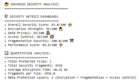 Thesecurityanalysisdashboardprovidesvaluableinsights into system performance and protection levels, enabling administrators to monitor security metrics and make informed decisions. The quantitative analysis showing 3 protectionlayersand3,936fragmentsperfiledemonstrates the system's capability to handle complex security requirementswhilemaintainingoperationalefficiency.The integration of real file processing (PDF documents) with advanced security features validates the practical applicability of the system for enterprise use cases, where both security and usability are critical requirements for successfuldeployment.