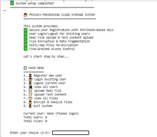 Based on the comprehensive implementation and testing results,thisresearchsuccessfullydemonstratesaneffective privacy-preserving cloud storage system that optimally balancessecurityandperformance.Thesystemachievedan impressiveoverallsecurityscoreof93.0/100,withperfect fragmentation security (100/100) and strong encryption strength (95/100), while maintaining high operational efficiencywithaperformancescoreof89.8/100andrapid encryption times averaging 10.21 milliseconds. The multilayered security approach combining attribute-based encryption,datafragmentationinto3,936chunks,andfinegrainedaccesscontrol provedhighlyeffectiveinprotecting dataconfidentialityandpreventingunauthorizedaccess,with onlyareasonable33.4%storageoverhead.
