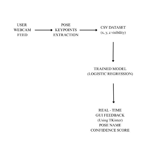 Figure 1 shows the complete pipeline of the system. It recognizes the overall directional point using the media pipe and is displayed in webcam-based pose input using conversion to CSV format, classification using logistic regressionviaTKINTER-basedgraphicsinterface,andrealtimefeedback.