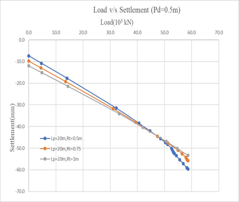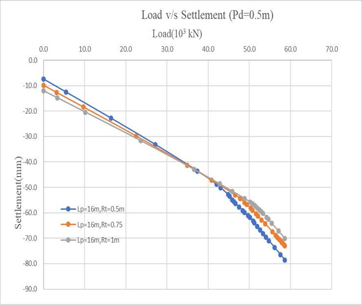 Fig1 shows theLoad vs Settlement response forvarying raft thicknesseswithafixedpilelengthof16m.Settlement reducesfrom78.59mmat0.5mraftthicknessto72.94mm at0.75mand70.05mm at 1.0m,indicatinga decrease of 7.18%and10.86%.Thistrendhighlightsimprovedstiffness andloaddistributionwithincreasedraftthickness.Hence, thickerraftscontributetobettersettlementcontrolinpiled raftfoundations.