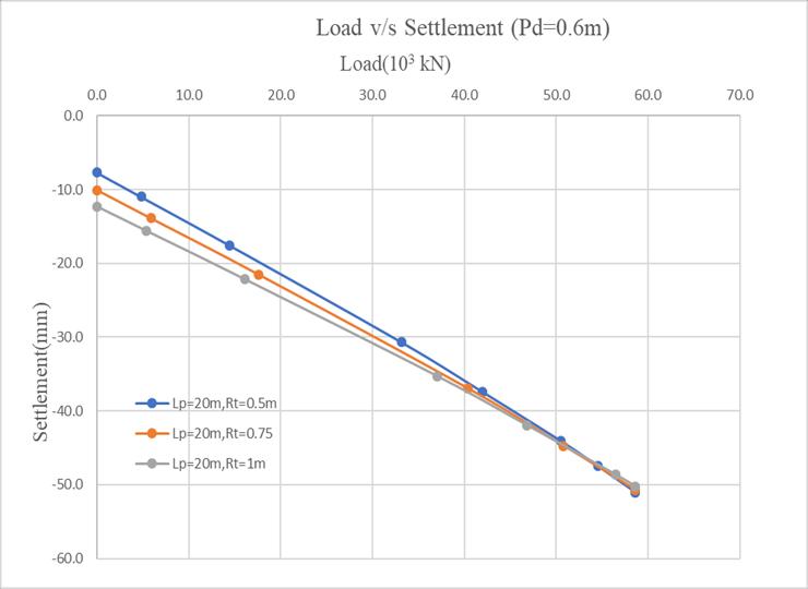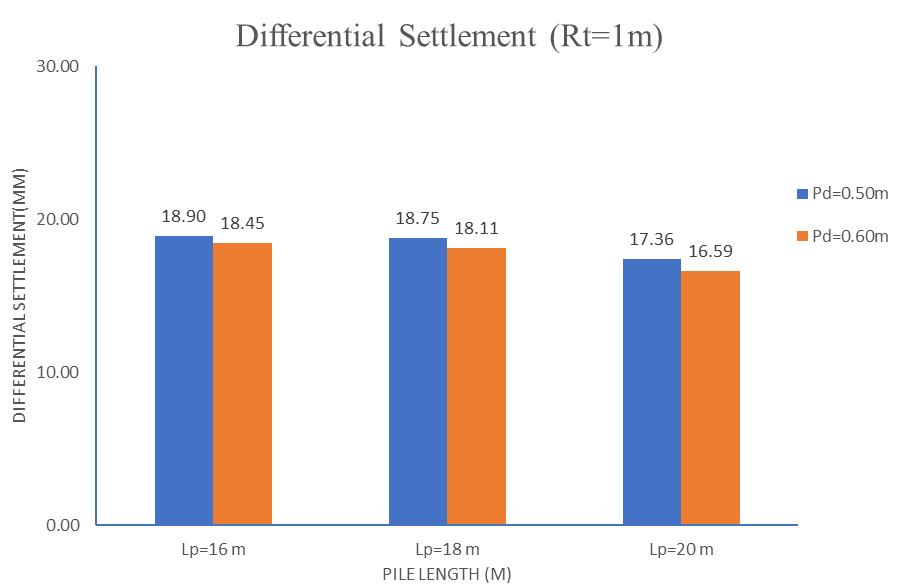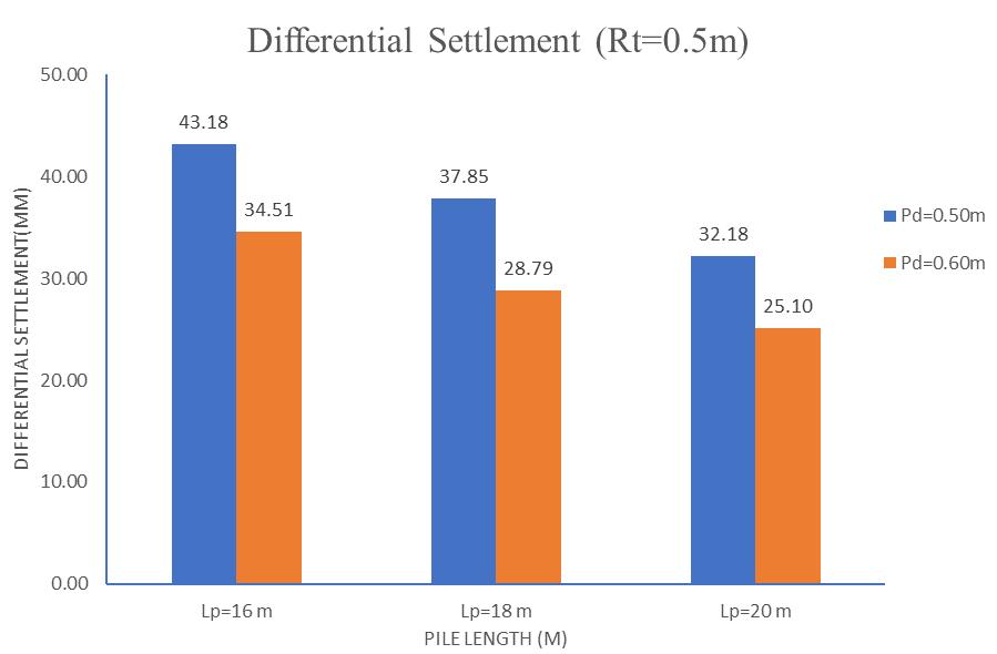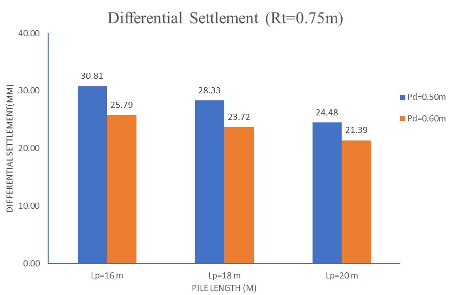 The effect of pile diameter was analyzed across three raft thicknesses (0.5 m, 0.75 m, and 1.0 m). Increasing the diameterfrom0.5 mto0.6 mledtoasignificantreductionin differential settlement, particularly for thinner rafts. For instance, at 0.5 m raft thickness, differential settlement reductions of 20.08% to 23.94% were observed across different pile lengths. However, as the raft thickness increasedto1.0 m,theinfluenceofpilediameteronreducing differential settlement became less significant, with improvements dropping to around 2–4%. This trend highlights that while larger pile diameters contribute to foundation stiffness and better settlement control, their relativeeffectismostprominentwhentheraftisrelatively flexible.