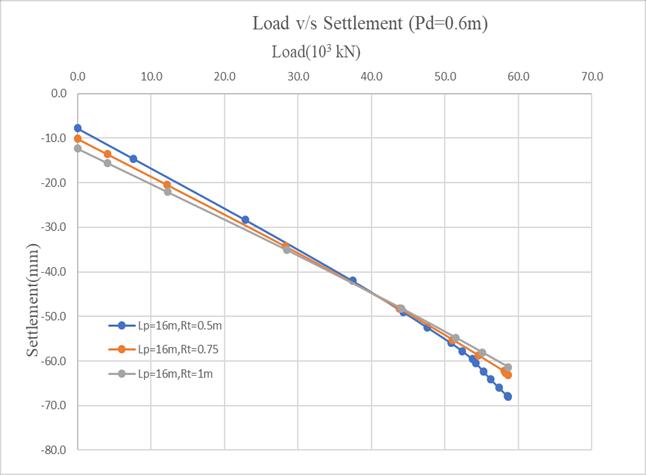 Fig4showstheLoadvsSettlementresponseforvaryingraft thicknesses with a fixed pile length of 16 m. Settlement reducesfrom68.02 mmat0.5 mraftthicknessto63.20 mm at 0.75 m and 61.39 mm at 1.0 m, indicating a decrease of 7.07%and9.74%.Thistrendhighlightsimprovedstiffness andloaddistributionwithincreasedraftthickness.Hence, thickerraftscontributetobettersettlementcontrolinpiled raftfoundations.