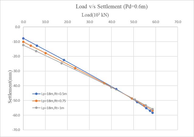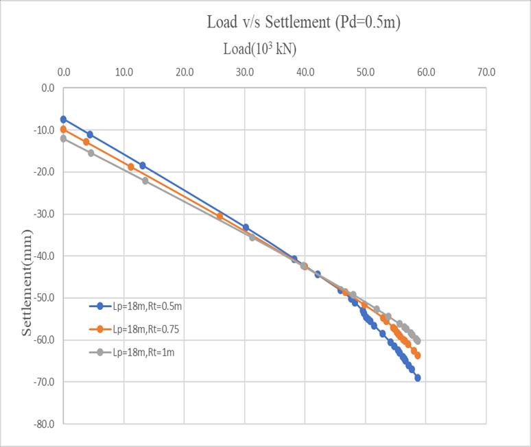 Fig2showstheLoadvsSettlementresponseforapilelength of 18 m with varying raft thicknesses. The settlement observed for a 0.5 m raft thickness is 68.99 mm, which reducesto63.6mmfor0.75mandfurtherto60.16mmfor 1.0m.Thiscorrespondstoasettlementreductionof7.72% and12.7%respectively.Theresultsindicatethatincreasing raft thickness improves overall stiffness and load distribution,therebyreducingsettlementsignificantly.