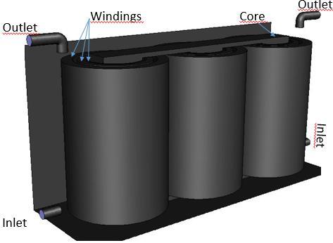 The 3D model considered is depicted in Figure 1. It is a three-phase winding and core assembly contained in a containercalledatank.Inordertosimplifythemodel,allthe internalsupportingstructuresandexternalradiatorswere not considered. Only the three windings composed of cylindricalinnerLVandouterHVwindingwereconsidered andsetinthethree-columncore.