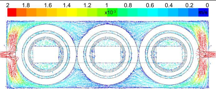 Finally,a0.1m/soilvelocitywasanalyzedinordertoobtain a deeperinsight intothedynamicsofoil flow through the windingsandcoreofthepowertransformer.
