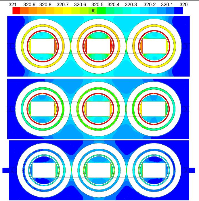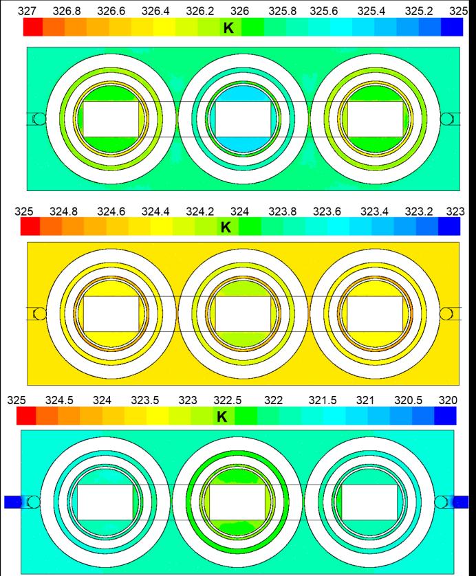temperaturesshownforthe0.002m/scaseareintheorder of328Kwhileforthe0.1m/scaseis321K.Thistrendgives aclearideaofhowtheincreaseinoilvelocitydecreasesthe oiltemperature.Also,thedistributionofoilhavingtwoinlets ismoreuniform,andmaximumoiltemperaturesarefoundin thetoppartofthewindings,whichareconcentratedinthe innerpartofthehighvoltagewindings.