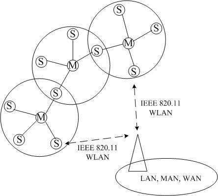 Madsen et al. proposed formation algorithms [3] for Bluetooth scatternet, which consists of infrastructure and ad hoc parts. The proposed scatternet structure can extend coverage and enable access of a larger number of users. And the formation algorithms can resolve the synchronization problem for creation of a height- and width-balancedtreetopology.