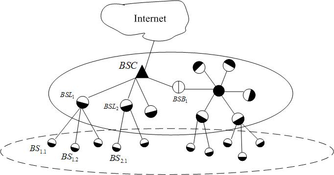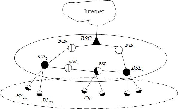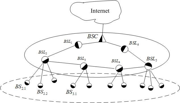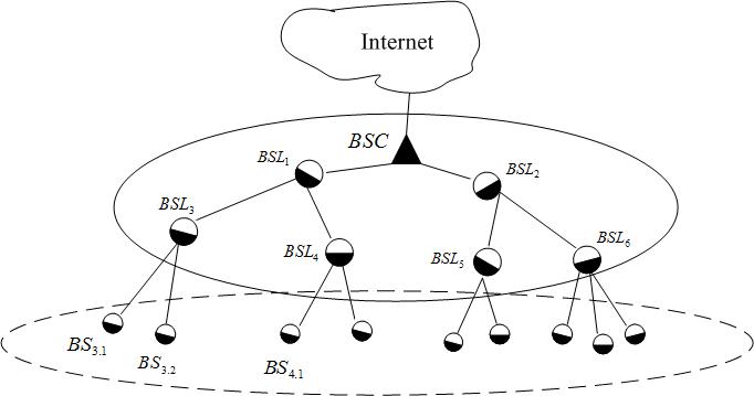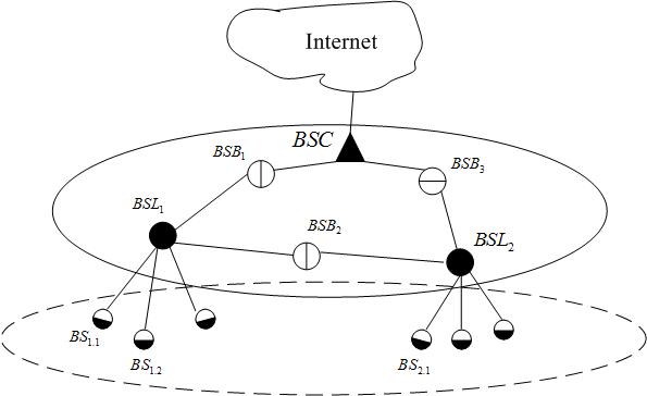 3)Tree: Whenmanymobiledevicesaredispersedina widearea,treearchitecturecaninterconnectlotsofBSsto support these mobile devices connecting to Internet. One of the characteristics of tree architecture is that the average path length is a logarithmic value of the total number of nodes. However, an inherent problem is that therootnodeisabottleneckfortraffic.Inthispaper, only the binary tree is considered. The BSC acts as the master role and the BSLs play the Master/Slave role as shown in Fig.8.