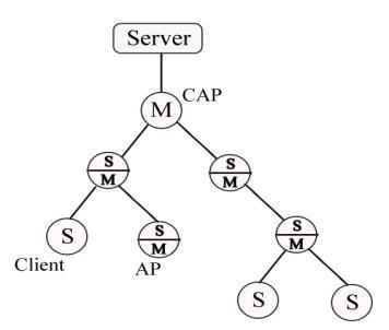 To extend the coverage of network and enable access of large number of clients, access points are interconnectedintoascatternet,whichisformedinatree topologyasshowninFig.2.Thecentralaccesspoint(CAP) isanaccesspointthatdirectlyconnectstothe server.The authors refer to this topology as master-slave separated treetopology.