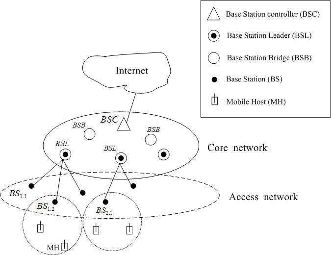 A two-level infrastructure for internetworking Bluetooth scatternet and Internet consists of the core network (the first level) and the access network (the second level) as shown in Fig. 5. A mobile node can connectandtransmitdatapacketstotheBaseStation(BS), and the BS gets and forwards them to the Base Station Leader (BSL) or the Base Station Bridge (BSB). The data packets are finally transmitted to Internet through the Base Station Control (BSC). The core network consists of BSLs and BSCs. On the other hand, the access network consistsoftheBSs.