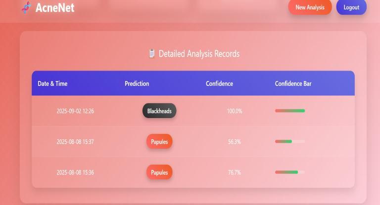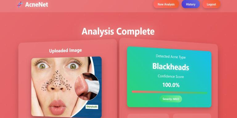 machine learning approaches that rely heavily on handcraftedfeatures.Thesystemachievedstrongaccuracy, stable performance across classes, and minimal misclassification rates, confirming its reliability for automated dermatological screening. The final model was integratedintoaFlask-basedwebplatform,enablingrealtimeacnedetectionthroughasimpleimageuploadinterface and making the system accessible to non-experts while reducingrelianceonclinicalpersonnel. For future development, expanding the dataset with a broader range of skin tones, ethnicities, age groups, and high-resolution samples collected under varied lighting environments will significantly enhance robustness and fairness.Incorporatingacneseveritygradingisacrucialnext step,allowingthesystemnotonlytoclassifylesiontypesbut also to quantify overall severity for practical treatment guidance.Additionalfeaturessuchaspersonalizedskincare suggestions,progressiontracking,andautomatedtreatmentplanrecommendationscouldfurtherincreasethesystem’s clinical usefulness. From a technical standpoint, adopting advanced architectures like EfficientNet, ResNet, or transformer-basedhybridmodelsmayboostaccuracyand reduce computation time. Cloud-based deployment, ondeviceoptimizationformobileapplications,andintegration withtelemedicineplatformswouldbroadenaccessibilityand support remote dermatological consultation. Long-term improvements could also include real-time lesion localization,heatmap-basedinterpretability,andsupportfor wearable imaging devices, making the system a more powerfulandcomprehensivetoolforautomatedskinhealth monitoring.