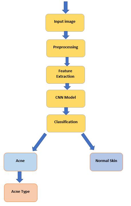 Thesystemarchitectureoftheproposedacneclassification model is depicted in Fig. 1. It begins with an input image, typicallyofthefaceoraffectedskinregion,capturedviaa cameraoruploadedbytheuserthroughthewebinterface. Oncetheimageisreceived,itispassedtothepreprocessing module, which is responsible for enhancing visual quality and ensuring that all inputs follow a standardized format. This module resizes the image to a fixed dimension, normalizes pixel intensities, removes noise, and applies contrastadjustmentssothatlesionpatternsbecomemore distinguishable.Thesepreprocessingstepsensurethatthe subsequentmodelreceivesclean,uniform,andinformationrich data, reducing the risk of misclassification caused by lighting variations or inconsistent image quality.After preprocessing,theimageentersthefeatureextractionstage, where convolutional operations automatically identify hierarchical visual patternsrelevantto acnelesions.Early convolutional layers focus on primitive features such as edges,gradients,andcolorvariations,whiledeeperlayers capture more complex structures like pore clusters, inflammation patterns, and lesion boundaries. This hierarchicalfeaturerepresentationeliminatestheneedfor