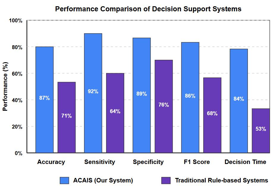 TheACAISsystemdemonstratedsuperiorpredictionperformancecomparedtotraditionalrule-basedsystemsacrossmultiple clinicaltasks.Fig 2 illustratesthecomparativeperformancemetrics.