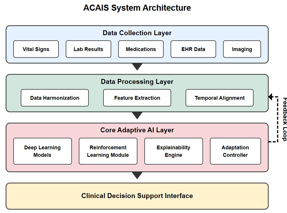 The ACAIS system architecture consists of four primary layers designed to enable real-time processing of clinical data, adaptivelearning,anddecisionsupportdelivery.Fig.1.illustratesthecompletesystemarchitecture.