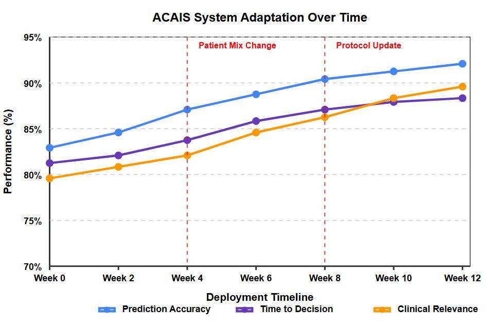 AkeyadvantageoftheACAISsystemisitsabilitytoadapttochangesintheclinicalenvironmentovertime. Fig 3 illustrates theperformancetrajectoryofthesystemacrossthreekeymetricsduringa12-weekdeploymentperiod.Duringthistime,two significantenvironmentalchangesoccurred:ashiftinpatientcasemixatweek4andanupdatetoclinicalprotocolsatweek8.