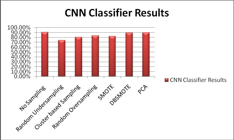 AfterRandomundersampling,wewillapplyClusterCentroid Samplingandcheckfortheresults.Thetable4.3belowshows the accuracy comparisons of all the classifiers after Centroid Cluster sampling. From the results, we can conclude that after Cluster Centroid Sampling, CNN has the better performance.