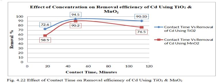 Theabovefig.4.22exhibitsacomparativegraphofremoval of Cd by TiO2 and MnO2 monoliths with varying Contact Timeof17.5to112.5minutes.ItisobservedthatTiO2 has highestremovalefficiencyof94.5%ascomparedwithMnO2 with90.2%atContactTimeof47.5minutes.