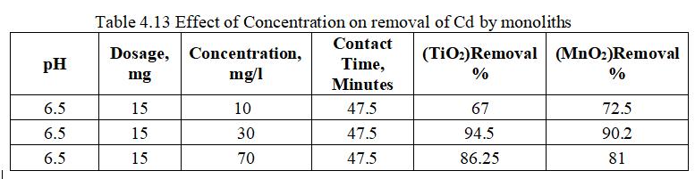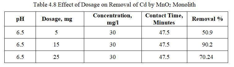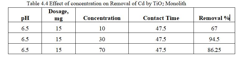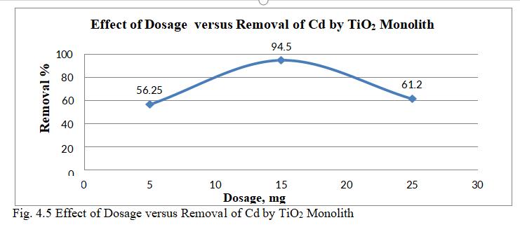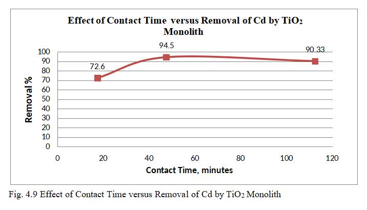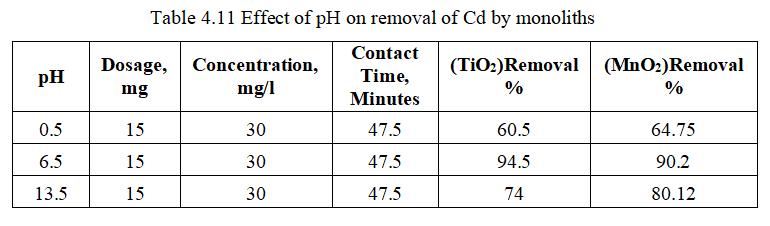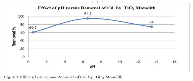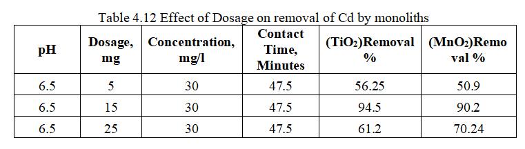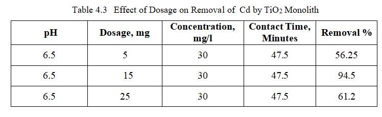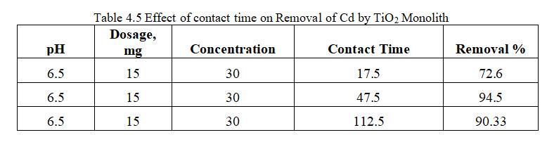 Fig.4.3 illustrates the removal efficiency of Cd by TiO2 monolith of 94.5% at pH of 6.5. Fig.4.4, shows 3D graph showing interaction of parameters at optimum dosage of 15mg,andcontacttimeof47.5minutes.