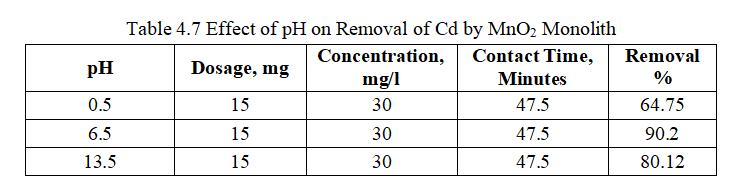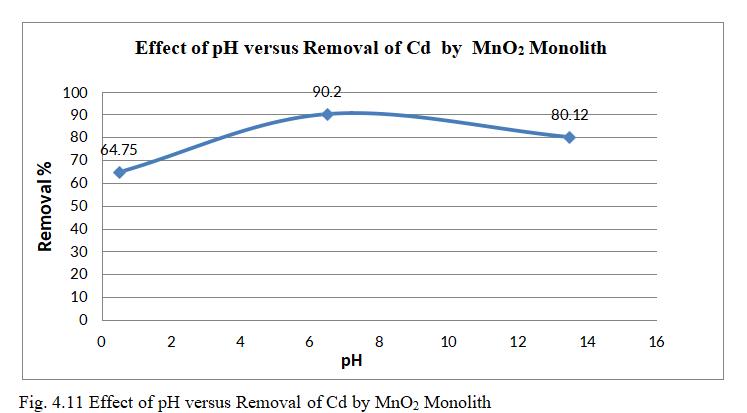 pH influence on adsorption of Cadmium by monoliths of metaloxide,dosageof15mg(MnO2)wasaddedto30mg/lof 100mlCadmiumsolutionat6.5pH.HClorNaOHwasadded toalterthepHofCadmiumsolution.