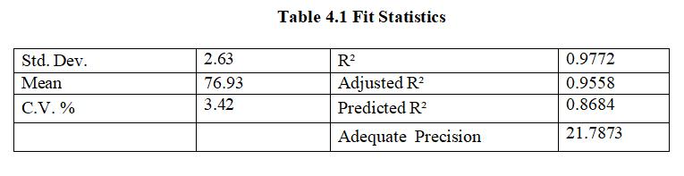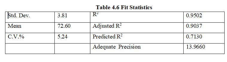 ThePredictedR²of0.8684isclosetoAdjustedR²of0.9558; i.e. difference being 0.2. Adequate Precision value with 21.787isacceptable,hencecanbeusedfordesign.