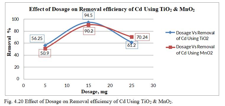 Fig. 4.20 shows a comparative graph on removal of Cd by TiO2 and MnO2 monoliths with varying Dosage from 5 to 25mg. TiO2 has highest removal efficiency of 94.5% as compared with MnO2 with 90.2% at optimum dosage of 15mg.