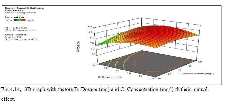Fig.4.13illustratesremovalofCdbyMnO2 monolithof90.2% at adsorbent dosage of 15mg. Fig.4.14, 3D graph showing interaction of parameters at pH 6.5 and concentration of 30mg/l.The above figure shows that adsorbent dosage is raised from 15 to 25mg; removal efficiency goes on decreasing,thoughthenumberofactivesitespresentmaybe more. This may be mainly due to Agglomeration of TiO2 monolithorunsaturationofsitesduringtheprocess.