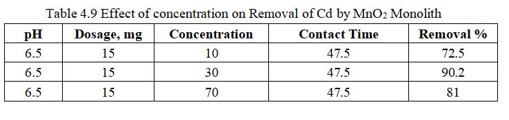 Fig.4.17 illustrates removal efficiency of Cd by MnO2 monolithof90.98%atconcentrationof30mg/l.Fig.4.18, 3D graph showing mutual effect of parameters at optimum dosageof15mgandpHof6.5.Theabovegraphsshowthat adsorption increases with increased Cadmium ion concentration upto 30mg/l. Increase in Cadmium ion concentration, the removal efficiency decreases due to limiting amount of adsorbent dosage.MnO2 monolith has shownremovalefficiencyof90.2%withoptimumpHof6.5, dosageof15mg,concentration0f30mg/lwithcontacttime of47.5minutes.