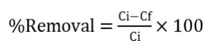 Removal % = -54.19267+8.19432* pH +11.81291*Dosage+0.474595*Concentration +0.655846*ContactTime-0.008071* pH * Dosage +0.011161* pH *Concentration +0.003516*pH*Contact Time-0.000437*Dosage*Concentration-0.008077*Dosage* Contact Time -0.003188*Concentration * Contact Time0.572279* pH² -0.365667* Dosage² -0.005885* Concentration²-0.003273*ContactTime².