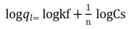 Where Cs = equilibrium concentration of the adsorbate (mg/l),ql=equilibriumadsorptioncapacityoftheadsorbent (mg/g),n=constanti.eadsorptionindex&Kf=Freundlich constant[14].