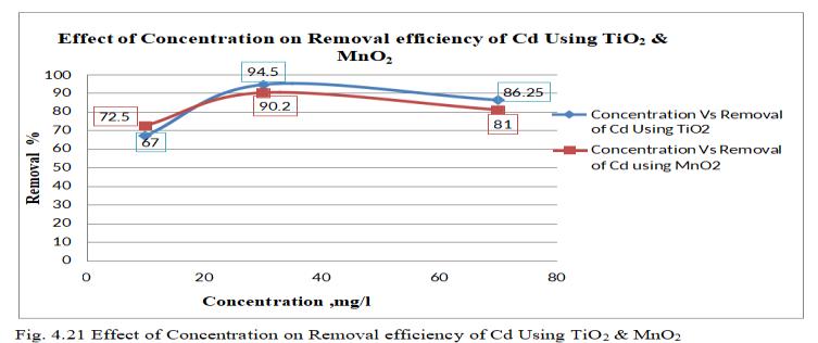 The above fig. 4.21 represents a comparative graph of removalefficiencyofCdbyTiO2 andMnO2 monolithswith varying Concentration of 10 to 70mg/l. TiO2 has highest removalefficiencyof94.5%ascomparedwithMnO2 with 90.2%atoptimumConcentrationof30mg/l.